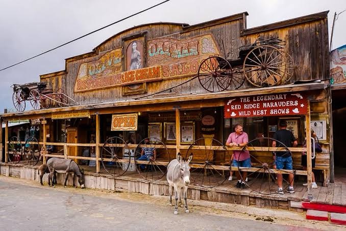 - Oatman. É a cidade fantasma com burros selvagens. Oatman era uma cidade de mineração nos anos 1800, mas quando o ouro acabou, foi abandonada. Hoje, virou uma cidade fantasma turística, cheia de lojinhas e burros que andam pelas ruas.